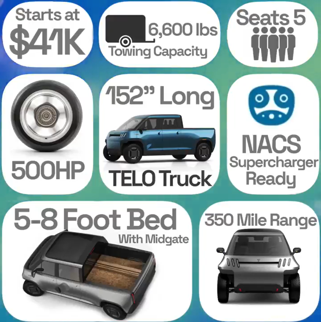Telo는 미국 캘리포니아주 샌카를로스에 본사를 둔 Telo Trucks라는 스타트업으로, 소형 전기 픽업트럭(MT1)을 개발하고 있습니다. 이 회사는 2023년 6월에 설립되었으며, 도시 생활과 주말 모험을 위한 효율적이고 컴팩트한 전기차를 목표로 하고 있습니다.